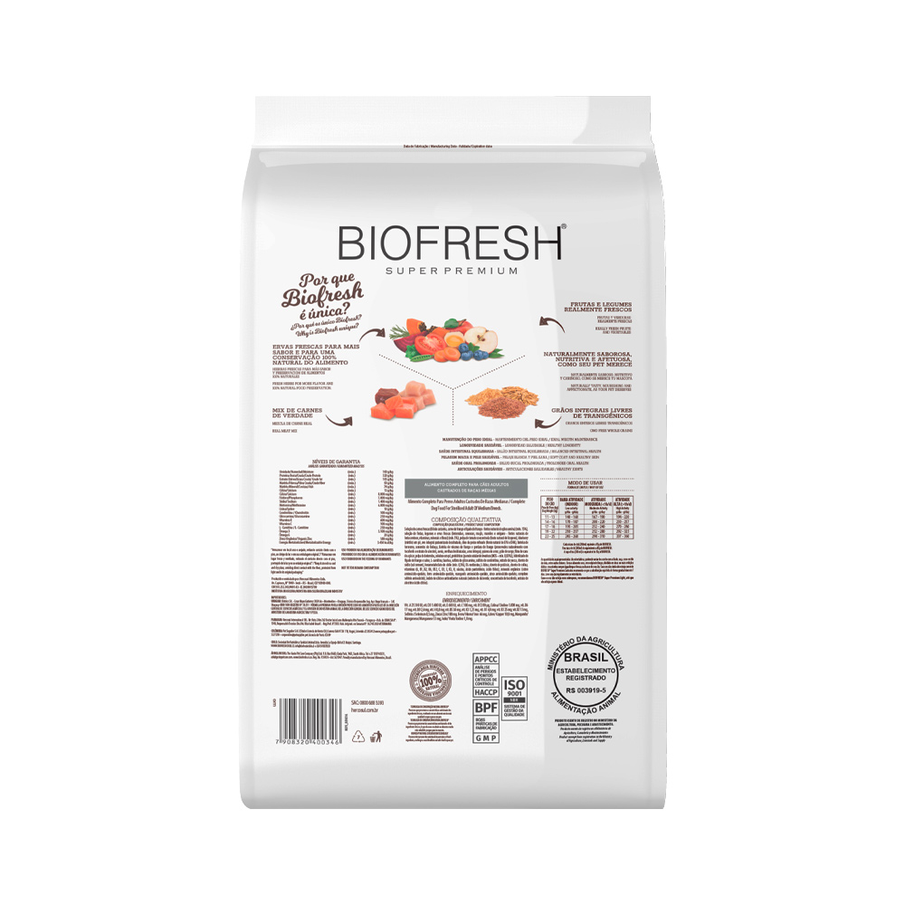 RAÇÃO BIOFRESH SUPER PREMIUM CÃO ADULTO CASTRADOS RAÇAS MÉDIAS MIX DE CARNES 3KG
